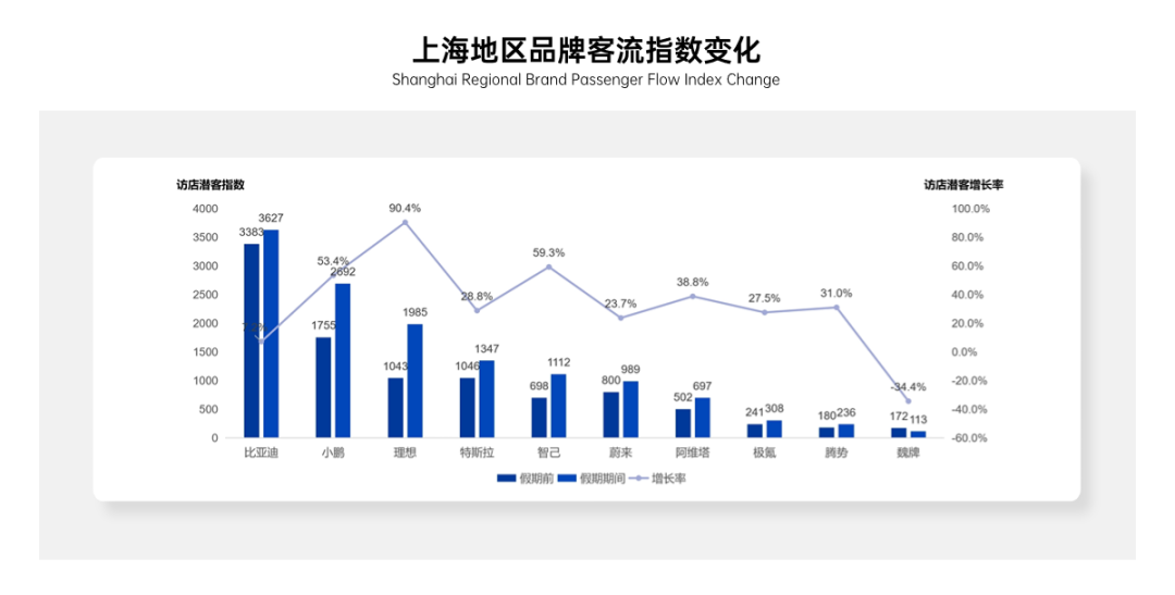 基于对上海市10个主要新能源品牌、217家线下门店客流的大数据监测发现:国庆假期期间,新能源线下门店客流量呈现出显著增长,平均增幅达到33.4%,日均客流量与平日周末水平相当。客流量呈现出先高后低的走势,假期第1天(9月29日)客流量为客流量的峰值。